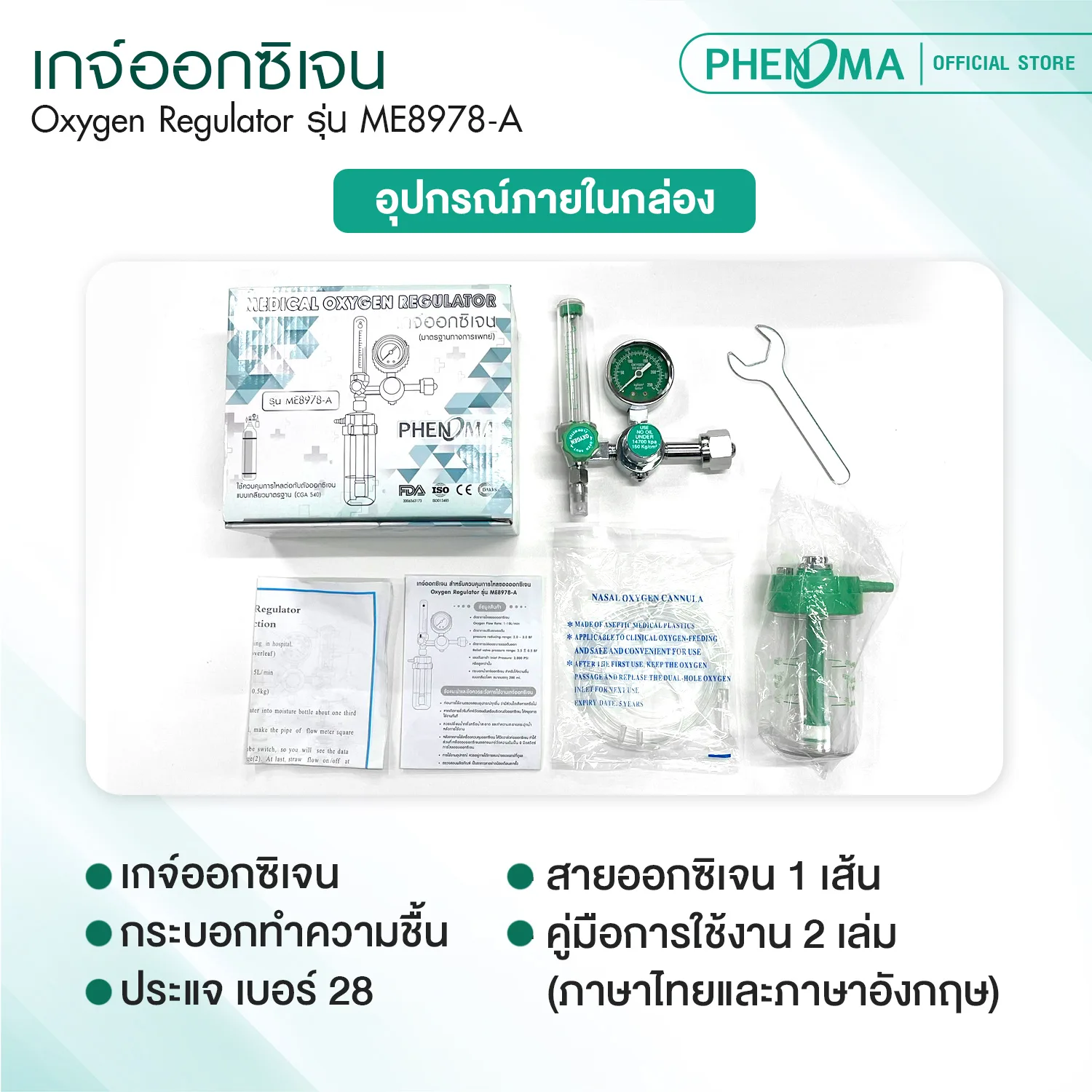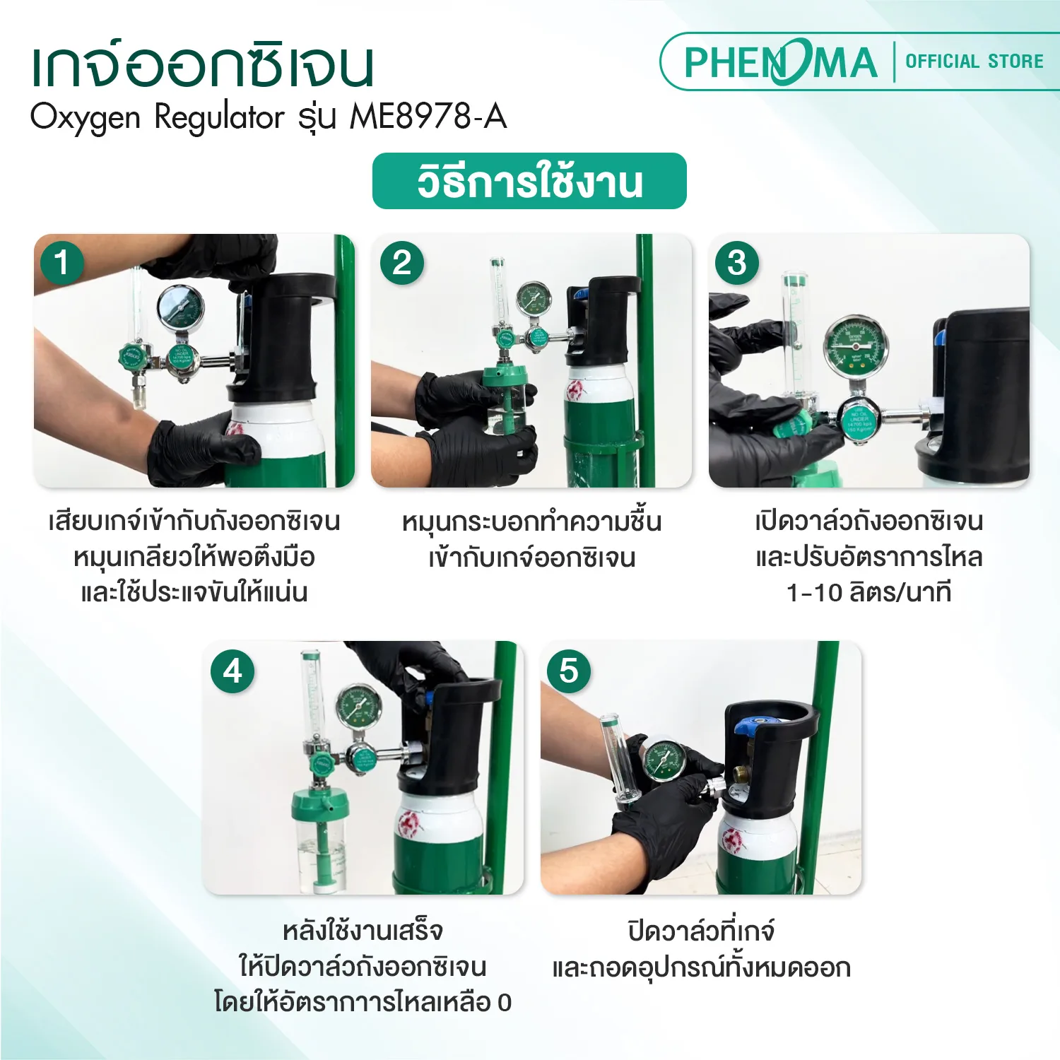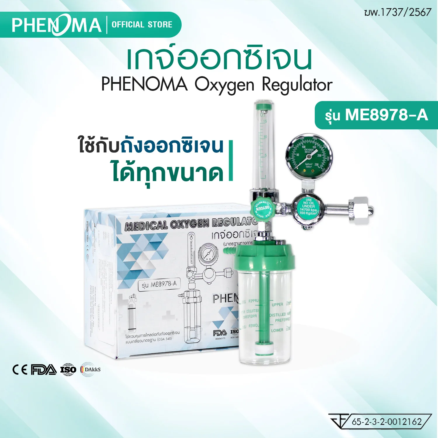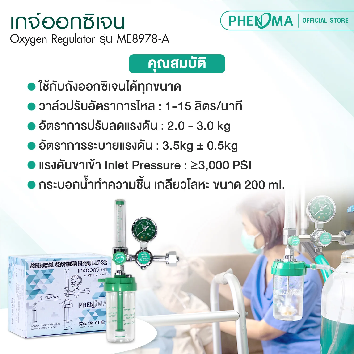 PHENOMA Oxygen Regulator อุปกรณ์ใช้ควบคุมแรงดัน และ อัตราการไหลของออกซิเจนที่เชื่อมต่อกับถังออกซิเจนให้เหมาะสมสำหรับการใช้งานทางการแพทย์ เพื่อทำให้การไหลของออกซิเจนผ่านสายออกซิเจน Cannula เข้าสู่ช่องจมูกผู้ป่วยมีความสม่ำเสมอ สามารถใช้ต่อถังออกซิเจนได้ทุกรุ่นทุกขนาด