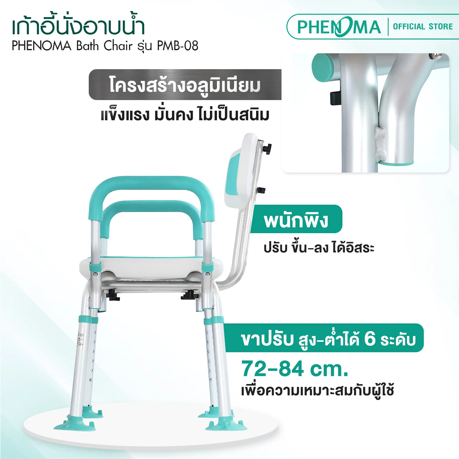 เก้าอี้นั่งอาบน้ำ PHENOMA Bath Chair รุ่น PMB-08 พร้อมที่เสียบฝักบัว ที่นั่งอาบน้ำผู้ป่วย ผู้สูงอายุ อลูมิเนียม แข็งแรง มั่นคง ปลอดภัย รองรับน้ำหนักได้ 125 kg. มาตรฐาน อย. ไทย