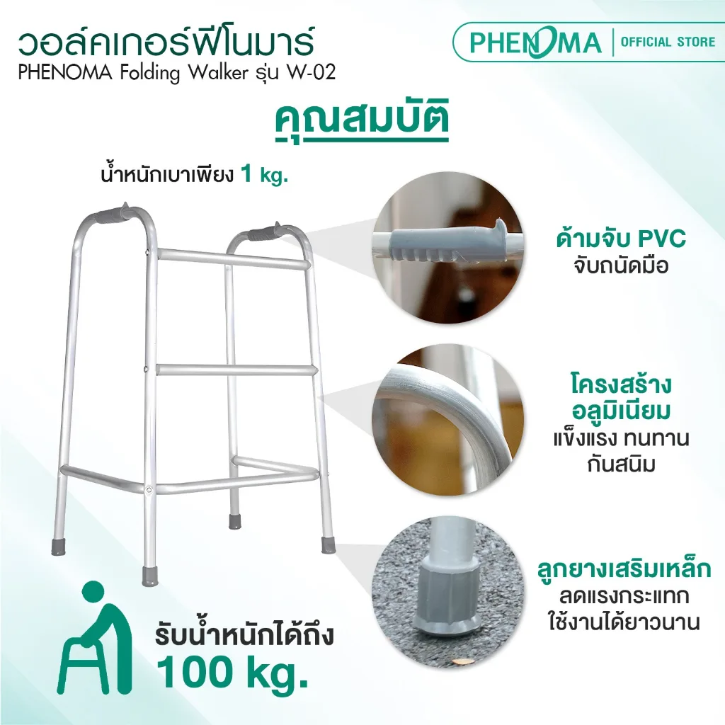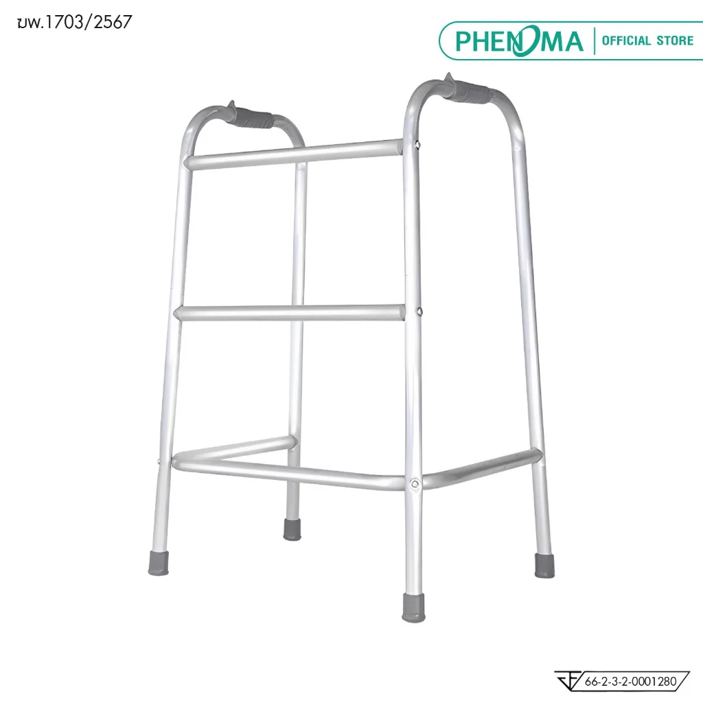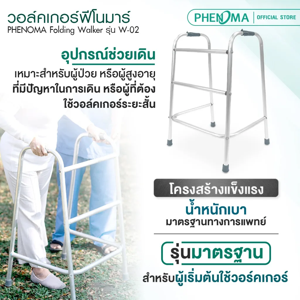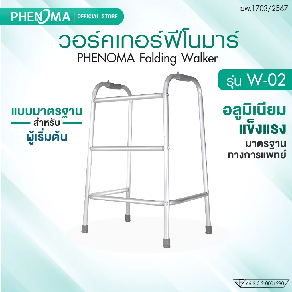 PHENOMA วอร์คเกอร์ 4 ขา Folding Walker รุ่น W-02 อุปกรณ์ช่วยเดิน วอร์คเกอร์พยุงเดิน อลูมิเนียม มาตรฐาน อย. ไทย